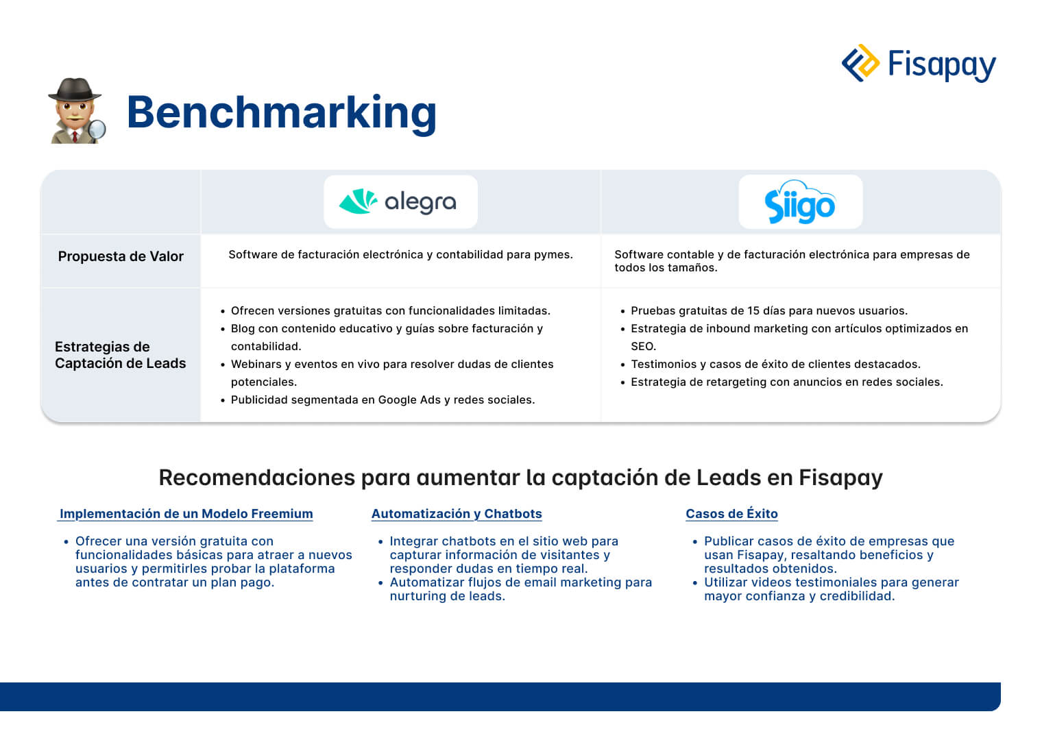 Se revisaron métricas clave como la tasa de conversión, el abandono del formulario y el comportamiento de los usuarios en la landing actual. Paralelamente, se realizó un benchmarking con competidores del sector financiero y contable como Alegra y Siigo, identificando buenas prácticas en sus páginas de aterrizaje.