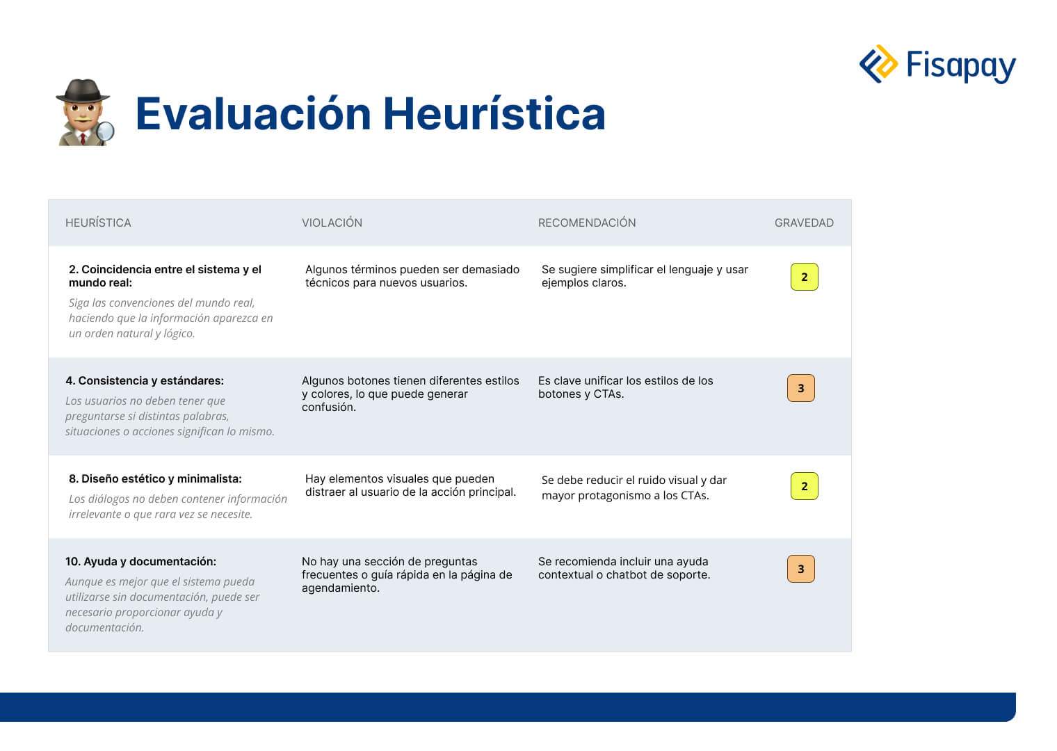 Como parte del análisis cualitativo, se aplicaron las heurísticas de usabilidad de Nielsen para detectar problemas de interfaz. Esto permitió encontrar inconsistencias visuales, un lenguaje excesivamente técnico, elementos distractores y la falta de ayuda contextual. A esto se sumaron entrevistas con usuarios reales como gerentes financieros y responsables de pagos, para entender sus expectativas, puntos de fricción y criterios de confianza al interactuar con una herramienta como Fisapay.