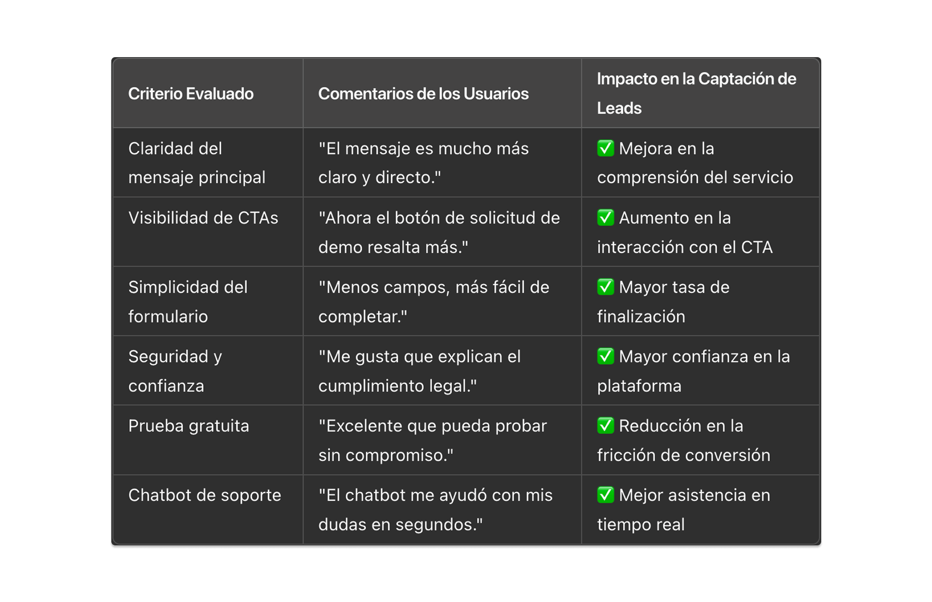 El prototipo fue validado a través de pruebas de usabilidad con 9 usuarios representativos del público objetivo. Se evaluó la comprensión del mensaje, la visibilidad del CTA, la facilidad para llenar el formulario y la percepción de confianza. Gracias al feedback recibido, se ajustaron textos, microinteracciones y elementos visuales antes del desarrollo final.