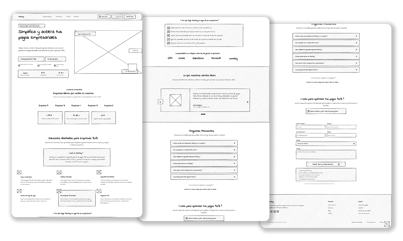 Con estos hallazgos, iniciamos la etapa de diseño. Se crearon wireframes de baja fidelidad que permitieron estructurar la nueva landing enfocándose en una jerarquía clara de contenidos: propuesta de valor directa, beneficios tangibles, prueba social y un formulario corto de solicitud de demo.