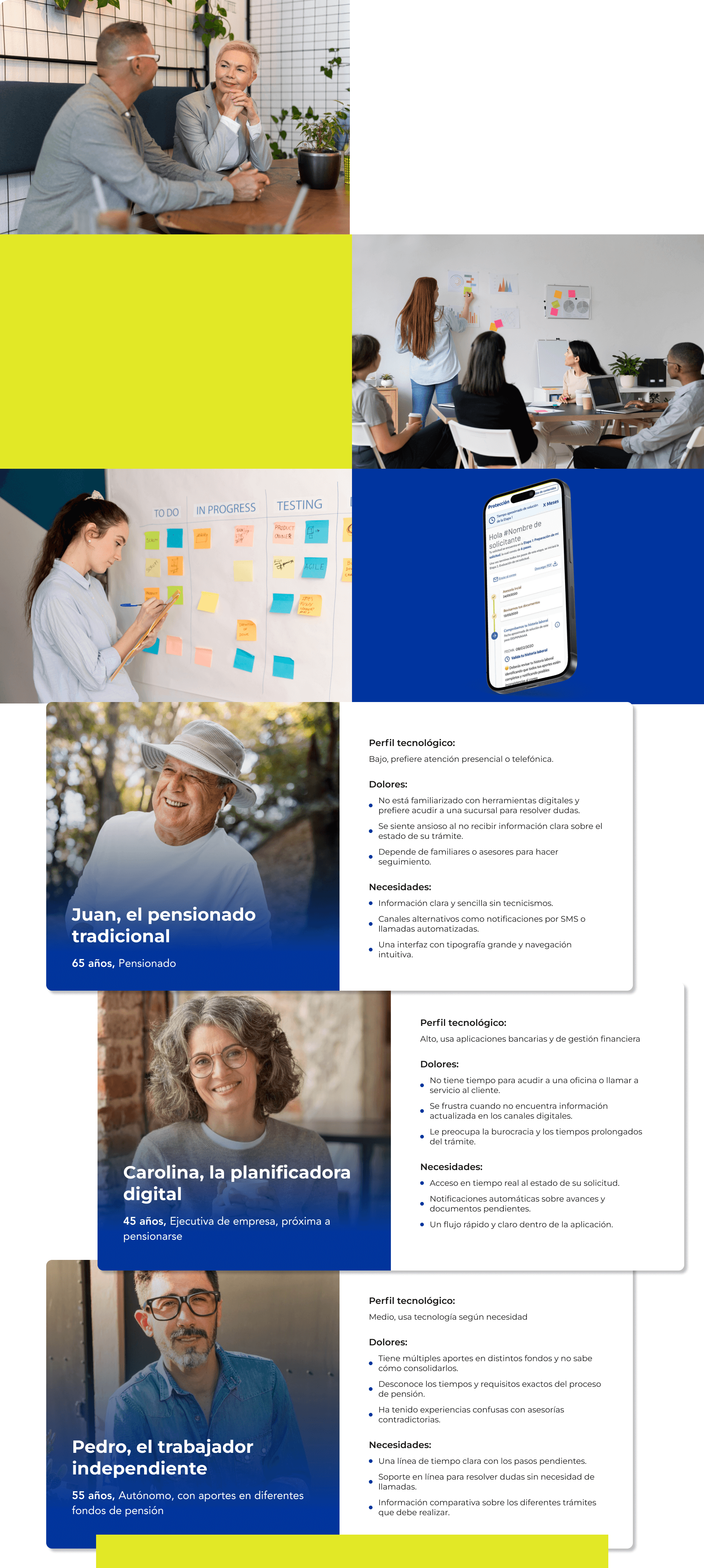 A partir de estas investigaciones, construimos arquetipos de usuarios que representaban los diferentes perfiles de clientes que enfrentaban este proceso: desde el pensionado que no se sentía cómodo con la tecnología hasta aquel que buscaba una solución digital ágil y eficiente. Estos arquetipos nos ayudaron a diseñar una experiencia que fuera accesible para todos.